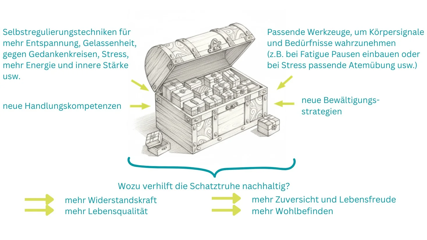 La personne concernée découvre ainsi ce qui lui fait du bien et ce qui l'aide. Elle sent ce qui lui permet de se détendre, de trouver davantage de paix intérieure et de sérénité ou encore de mieux dormir. Elle développe des techniques de régulation individuelles qui l'aident à gérer le stress, les pensées obsessionnelles ou la douleur. Elle se dote ainsi peu à peu d'outils précieux, de compétences pratiques et de stratégies d'adaptation auxquels elle peut recourir à tout moment et qui lui permet de parvenir à un niveau d’efficacité personnelle durable.